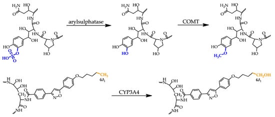 Metabolites of micafungin. Top: The original sulphate group (blue) on the dihydroxyhomotyrosine amino acid residue is metabolized to a hydroxyl group followed by its methylation. Bottom: the third and minor metabolite arises from hydroxylation of the methyl group (orange) at the ω1 position of the lipophilic side chain. COMT = catechol-O-methyltransferase.