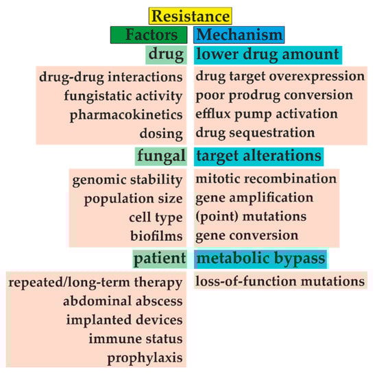 The emergence of microbial resistance is given by three main factors, including choice of antifungal treatment, type of fungal species, and patient medical history. For example, adequate dosing and distinguishing between fungistatic/fungicidal drug effects are mandatory for successful treatment. Unfortunately, repeated antifungal therapy and often prophylaxis narrow the appropriate drug selection. With the fungal biofilm formation, this task becomes more problematic. Furthermore, fungi often decrease drug concentration by efflux pump activation or target overexpression. Additionally, these targets can be amplified or changed due to several types of mutations, such as amino acid substitution. Modified from [64,65].
