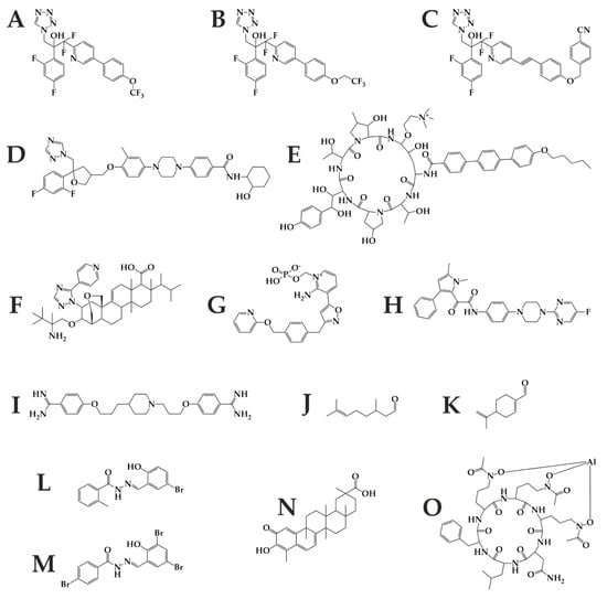 Future antifungal therapy may benefit from these substances including tetrazoles VT-1129 (A), VT-1161 (B), VT-1598 (C); triazole PC1244 (D); echinocandin rezafungin (E); triterpenoid Ibrexafungerp (F); inositol transferase inhibitor Fosmanogepix (G); dihydroorotate dehydrogenase inhibitor Olorofim (H); histone deacetylase inhibitor MGCD290 (I); monoterpenoids citronellal (J) and perillaldehyde (K); brominated acylhydrazones BHBM (L) and its derivative D13 (M); triterpenoid celastrol (N); and hydroxamate type siderophore VL-2397 (O).