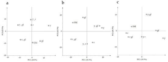 PCA of the volatile composition revealed that the first two components explained about the 54% of the total variance; the score plot showed the position of the double mutants, related to their parental lines, and with respect to SM (Figure 2a). Indeed, r and y_r were co-located in the same dial, in agreement with the VOC untargeted metabolome plot; conversely, r_gf placed halfway between r and gf according to PC1 (Figure 2a). Moreover, PC1 kept the mutants r and y_r separated from the other lines. PC2 placed y_r and its parental lines in the upper side of the graph, together with SM. The corresponding loading plot was able to identify groups of metabolites, often belonging to the same metabolic pathways, as apocarotenoids (C, in red) and lipids (L, in light blue), terpenoids (T, in green blue) and branched-chain amino acid derivatives (BCAA, in blue; Figure 2b). A comparison between the score and the loading plots revealed the overall compositional differences between the mutated lines.