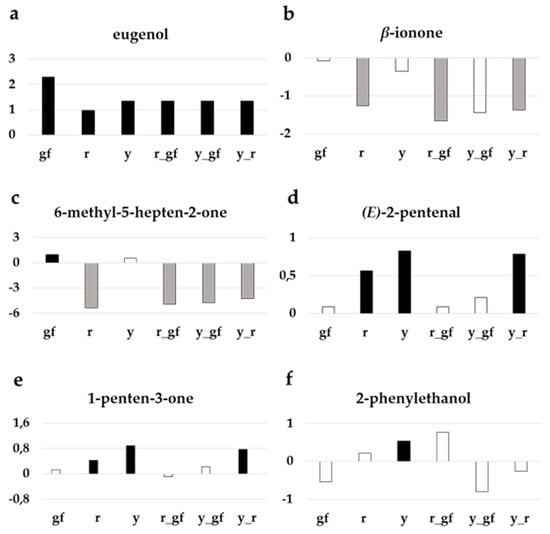 Relative log2 variation in selected volatiles involved in tomato flavor: (a) eugenol, (b) β-ionone, (c) 6-methyl-5-hepten-2-one, (d) (E)-2-pentenal, (e) 1-penten-3-one, (f) 2-phenylethanol in the six fruit mutant lines in San Marzano (SM) background compared with the recurrent parent. Line symbols are reported in Table 1. Bars colored in grey and black indicate means significantly lower and higher than SM for p ≤ 0.05 after Student’s t-test, respectively.