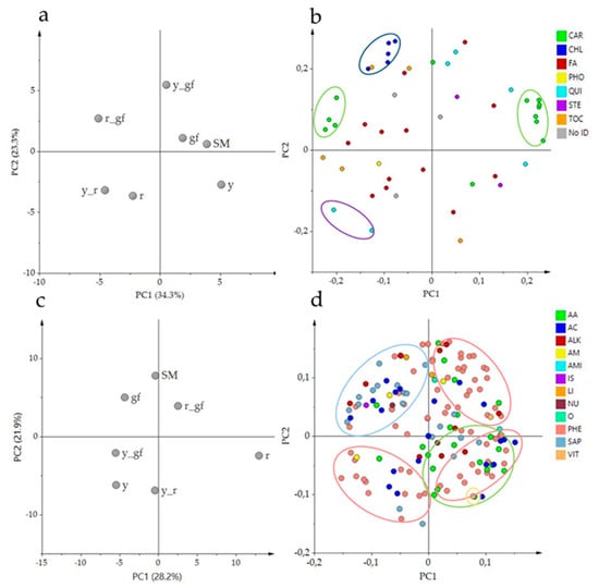 PCA of log2 values of 54 NP (a,b) and 128 P (c,d) metabolites measured by LC-HRMS. (a–c) PC1 × PC2 score plot of the six mutated lines plus San Marzano (SM). (b–d) PC1 × PC2 corresponding loading plots. Line (a,c) and metabolite class (b,d) abbreviations are explained in Table 1 and Table 2 respectively.
