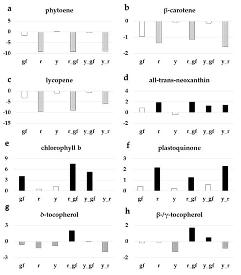 Relative log2 variation in (a) phytoene, (b) β-carotene, (c) lycopene, (d) all-trans-neoxanthin, (e) chlorophyll b, (f) plastoquinone, (g) δ-tocopherol, (h) β-/γ-tocopherol, of six fruit mutant lines in San Marzano (SM) background compared with the recurrent parent. Line symbols are reported in Table 1. Bars colored in grey and black indicate means significantly lower and higher than SM for p ≤ 0.05 after Student’s t-test, respectively.