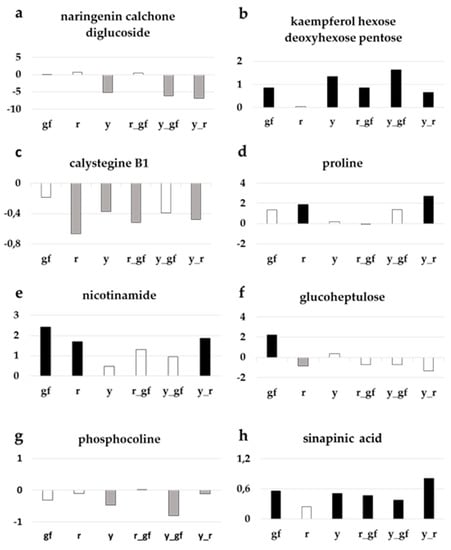 Relative log2 variation in (a) naringenin chalcone glucoside, (b) kaempferol-hexose-deoxyhexose-pentose, (c) calystegine B1, (d) proline, (e) nicotinamide, (f) glucoheptulose, (g) phosphocoline, (h) sinapinic acid, of six fruit mutant lines in San Marzano (SM) background compared with the recurrent parent. Line symbols are reported in Table 1. Bars colored in grey and black indicate means significantly lower and higher than SM for p ≤ 0.05 after Student’s t-test, respectively.