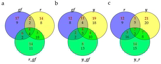 Venn diagrams for (a) gf, r and r_gf; (b) gf, y and y_gf; (c) r, y and y_r. Red and black numbers correspond to up- and down-regulated metabolites, respectively.