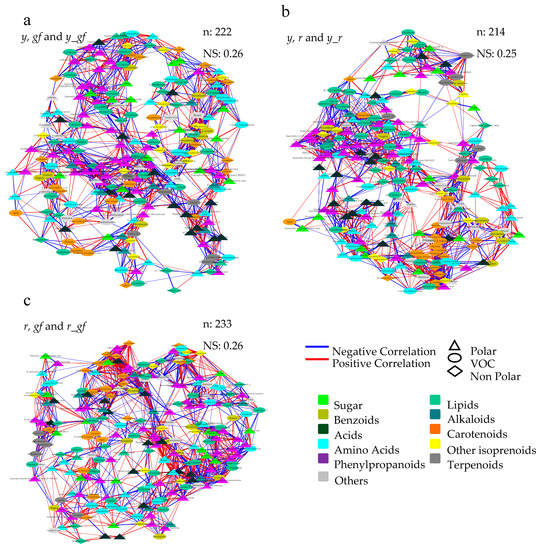 Correlation networks of metabolomics data in (a) y, gf and y_gf; (b) y, r and y_r; (c) r, gf and r_gf mutants. All the data from volatile (VOC), non-polar (NP) and polar (P) analyses were used as fold change to the San Marzano (SM) reference. Network topology was directed by the force of Pearson correlation coefficient index (Table S6). Each node represents VOC (turquoise circle), a NP (diamond) or a P (triangle) metabolite. Lines joining the nodes represent positive (red) or negative (blue) correlations. Node sizes are proportional to the respective node strengths, which are shown in Tables S7–S9. Node color is depending on the metabolic class of each compound as indicated in the figure. Number of nodes (n) and network strength (NS) are shown at the top of each network. Only correlations with |ρ| > 0.95 are shown (p ≤ 0.05).