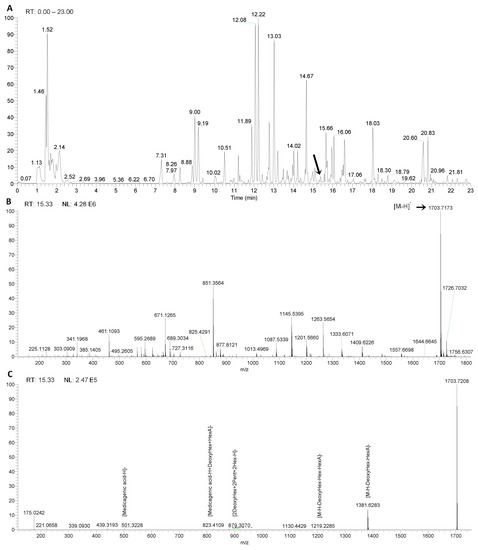 Figure 3 illustrates the identification of a hitherto unknown saponin. As shown in Figure 3A, the unknown saponin has a retention time of 15.33 min. Figure 3B shows a molecular ion at m/z 1703.71838 [M-H]−. Since saponins contain the elements C, H and O, 19 molecular formulas are possible within an error range of 5 ppm.