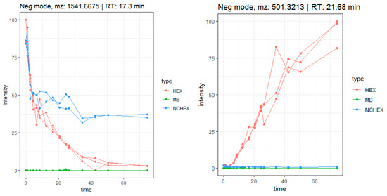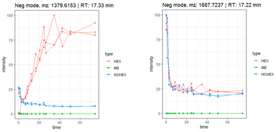 Time profile of the biotransformation of compounds 46 (left) and 45 (right) in samples (HEX), negative controls (NCHEX) and blank (MB).