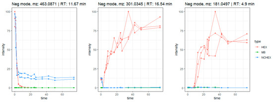 Time profiles of biotransformation of isoquercetin (m/z 463.0871 [M-H]−), quercetin (m/z 301.0345 [M-H]−) and a metabolite (m/z 181.0497 [M-H]−) tentatively identified as 3,4-dihydroxyphenylpropionic acid or 3-methoxy-4-hydroxyphenylacetic acid.