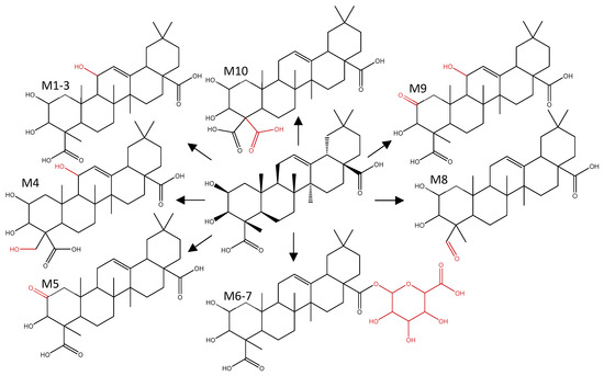 Figure 10 shows an overview of the proposed metabolic pathway of medicagenic acid after S9 biotransformation. For metabolites 1–3 (M1–3), three different chromatographically separated peaks were observed (rt 17.39; 17.60 and 18.45 min), suggesting the presence of three different structural isomers. This was confirmed by the prediction provided by Meteor. The software proposed hydroxylation at C-11, C-24, or C-29. Double hydroxylation (M4), oxidation of a hydroxy group (M5) and a combination of hydroxylation and oxidation (M9–10) were also predicted by Meteor. The nontarget screening approach confirmed the formation of the predicted metabolites, and one additional metabolite was detected. Metabolite 8 (M8) shows a reduction of the carboxylic acid moiety. However, limited by the poor MS/MS fragmentation of the aglycones and lack of NMR data, identification remains tentative. Further elucidation of the molecular structures was not possible. The only phase II products observed were glucuronidated metabolites of medicagenic acid (M6–7). Sulfation reactions were not observed, although they were predicted by Meteor and Biotransformer. To confirm that the in vitro model was capable to form sulfated conjugates, biotransformation of testosterone was examined as positive control. Testosterone was analyzed after hepatic biotransformation and proved the capability of the in vitro model to form both sulfated and glucuronidated conjugates.