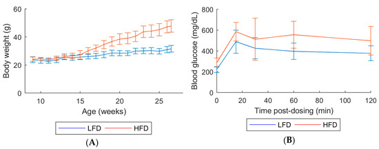 (A) Body weight measured weekly. (B) Glucose tolerance test at age 18 weeks. Animals in each group: 10 males. Error bars indicate the standard deviation of biological replicates (n = 10). Abbreviations: LFD, low-fat diet; HFD, High-fat diet.