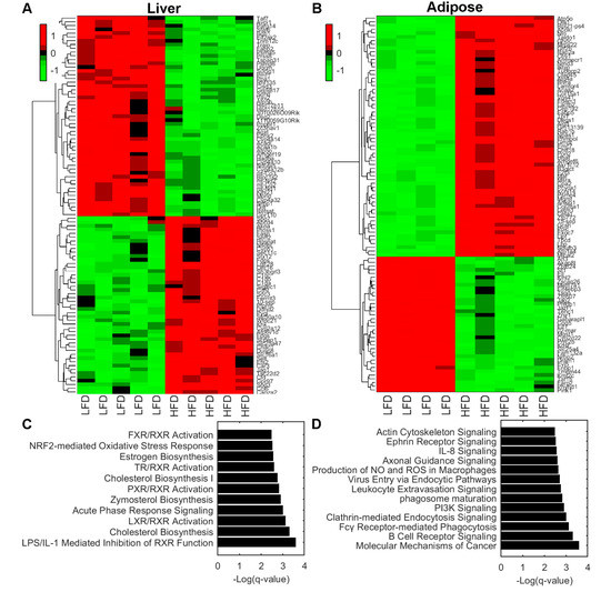 (A,B) Hierarchical clustering of top 100 significant differentially expressed genes in liver tissue (A) and adipose tissue (B). (C,D) Pathway enrichment analysis using Ingenuity Pathways Analysis software of liver tissue (C) and adipose tissue (D). Statistical significance is expressed as q values of a right-tailed Fisher’s Exact test with multiple hypothesis correction based on the Benjamini–Hochberg approach. Abbreviations: LFD, low-fat diet; HFD, High-fat diet.