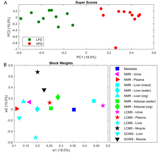 Metabolite profiling was performed on tissues and biofluids by multiple analytical techniques to evaluate the whole metabolome of C57BL/6J mice. A combined analysis of urine, plasma, liver, adipose tissue, and muscle tissues were completed by NMR, LC-MS and GC-MS. In an effort to combine the metabolomes across tissue and biofluids a multi-block PCA (MBPCA) approach was undertaken (Figure 3). Mice fed LFD and HFD were perfectly separated by the MBPCA method (Figure 3A). The block weights show the importance of the loading within each block on the overall grouping (Figure 3B), with urine and liver shown to contain most differential data supporting the LFD/HFD differences.