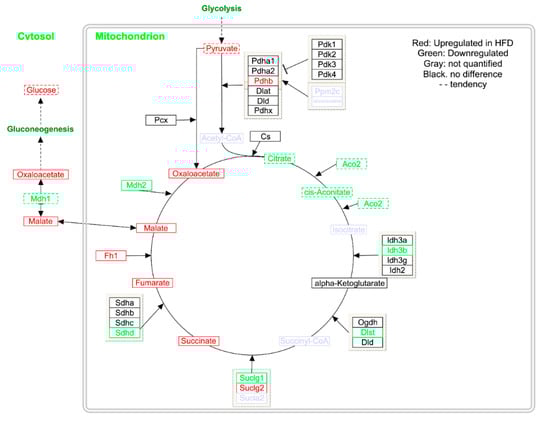 The tricarboxylic acid (TCA) cycle showing differences in gene expression and metabolite abundances in mouse liver. Upregulated in HFD are shown in red, and those that were downregulated are shown in green, genes and metabolites not quantified are shown in gray. Data is shown in Table 1 and Table S2.