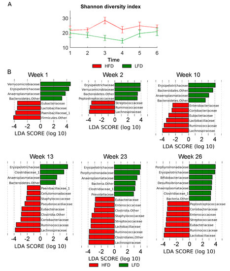 (A) α-diversity (Shannon diversity index). (B) Histograms showing the log-transformed Linear discriminant analysis (LDA) scores computed with Linear discriminant analysis effect size (LEfSe) for significantly different bacterial taxa between diet groups at the different sampling time points. A positive LDA score indicates enrichment in LFD, whereas a negative LDA score indicates enrichment in HFD. The LDA score indicates the effect size and ranking of each bacterial taxon. Statistical significance was evaluated using the Kruskal–Wallis test (alpha < 0.05) and a log-transformed LDA score with a threshold of 2.0. Error bars indicate the standard deviation of biological replicates (n = 10). Abbreviations: LFD, low-fat diet; HFD, High-fat diet.