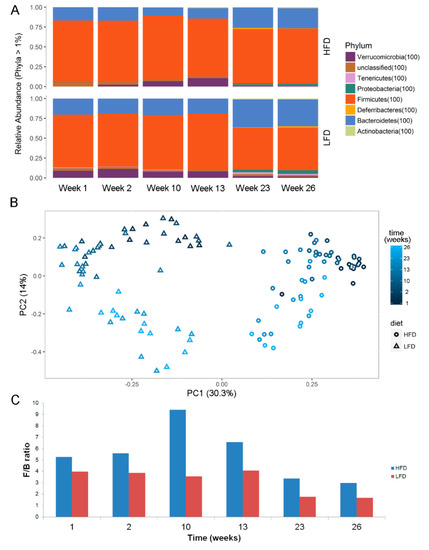 (A) Phyla abundance and (B) Unsupervised ordination using Bray–Curtis dissimilarity-based principal coordinates plot showing clusters of diets (PC1) and time (PC2). (C) ratios of relative abundance of firmicutes and bacteriodetes (F/B ratio) at different time-points. Abbreviations: LFD, low-fat diet; HFD, High-fat diet.