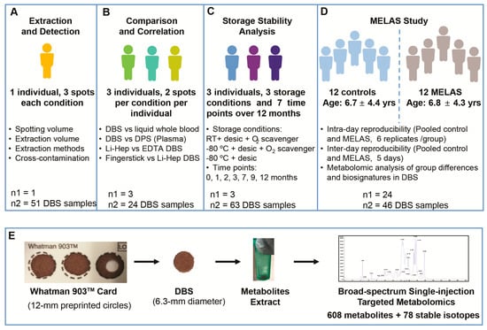 In this study, we developed a DBS-based broad-spectrum, targeted metabolomic method and performed the systematic optimization of critical steps in the workflow. The effect of variations in blood spot volumes, extraction methods, carryover, the comparability with other types of blood samples, and the potential influence of hematocrit variations were analyzed. Additionally, the stability of over 400 metabolites stored as DBS samples under three different storage conditions was analyzed periodically for up to one year. The analytical reproducibility and potential clinical utility were demonstrated with DBS samples prepared from 12 pediatric patients with MELAS and 12 age- and sex-matched controls.