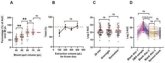 Dried blood spot (DBS) workflow optimization. (A) The effect of blood spot volumes. (B) The effect of the volumes of the extraction buffer. (C) The different extraction methods. (D) The effect of cross-contamination between punches. A total of 47 representative metabolites covering the whole gradient were selected for the analysis. Data were mean ± SD. One-way ANOVA followed by Tukey’s test was used. **p < 0.01 and ns indicated non-significant.