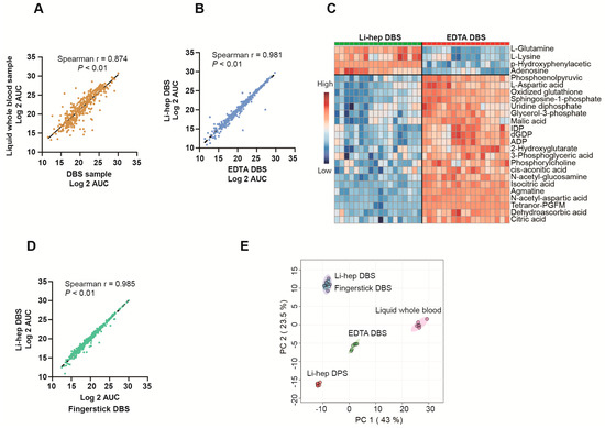 Sample type comparisons. (A) The correlations of areas under the curve (AUCs) of metabolites between wet blood and DBS. All 430 detected metabolites were used and the AUCs were log 2 transformed. The Spearman rank correlation was performed. The other correlation analyses in this figure were similarily performed. (B) The correlations of metabolite AUCs between Li-hep DBS and EDTA DBS. (C) The differentially abundant metabolites between Li-hep DBS and EDTA DBS visualized on the heatmap. The top 25 significant metabolites ranked by the student’s t-test were listed. p < 0.01. (D) The correlations of metabolite AUCs between Li-hep DBS and fingerstick DBS. (E) A Principal component analysis (PCA) of the five different sample collection methods showed that samples collected by fingerstick lancet and heparinized venous blood were superimposable.