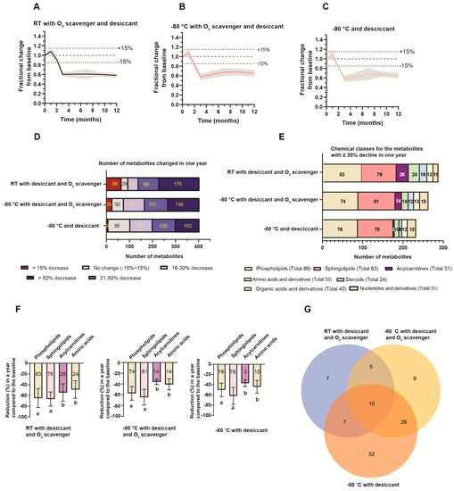 Stability analysis. (A–C) The fractional change over a year from the baseline for the geomean of all detected metabolites. (A) DBS stored at room temperature (RT) with desiccant and an O2 scavenger (RT with desiccant and an O2 scavenger). (B) DBS stored in −80 °C with desiccant and an O2 scavenger. (C) DBS stored in −80 °C with desiccant. The shaded area represents the standard deviations (SD). (D) The number of metabolites altered in a year of storage in different conditions. (E) The chemical classes for the metabolites with ≥ 30% decline in one year. The number of metabolites changed was listed in the graph and the total number of targeted metabolites in each chemical class was shown in the legend. (F) The percentage of reduction (%) from the baseline for the metabolites in the major chemical classes. The value in the bar graph was the total number of metabolites in each chemical class. A one-way ANOVA followed by Tukey’s test was conducted. Data indexed by different letters (“a” and “b”) were significantly different from each other (p < 0.05) in each storage condition. (G) The number of stable metabolites over one year of storage in each storage condition. The names of the stable metabolites are listed in Table S7.