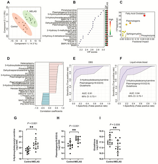Metabolomic fingerprints and biomarkers in DBS of MELAS patients. (A) Partial least squares discriminant analysis (PLS-DA) revealed the complete separation of MELAS patients from the controls (N = 12/group). (B) variable importance in projection (VIP) plot of the top 20 metabolites with the highest separation power between the controls and MELAS patients in PLS-DA. A VIP score > 1.5 was considered as statistically significant. (C) A pathway analysis of the significantly altered metabolites in the DBS of MELAS patients compared to the controls. The fractional impact of a pathway is defined as the sum of the absolute values of z-scores for the significant metabolites (PLS-DA VIP score > 1.5) divided by the sum of the absolute values of z-scores for all the detected metabolites in that pathway. (D) The top 20 metabolites correlated with heteroplasmy. A Spearman correlation analysis was performed. (E) A receiver operator characteristic (ROC) analysis to evaluate the diagnostic performance of three selected metabolites in DBS for MELAS. (F) The diagnostic performance of the same three metabolites in Li-heparin liquid whole blood for MELAS. Data were log 2 transformed before analysis. (G–I) Univariate statistical analysis of three selected biomarkers in the DBS of MELAS and controls. A Student’s t-test was performed after the log 2 transformation of the data.