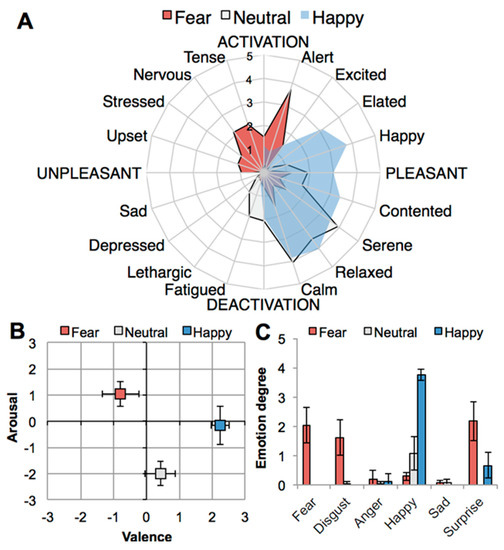 Effects of emotion induction (fear, neutral, happy) on self-reported emotional state: (A) Spider plot showing participants’ emotion profiles on affective circumplex [46]; (B) experienced core affect (valence, arousal) on affect grid [47]; (C) experienced discrete emotions. Error bars: ± 1 standard error of the mean (SEM).