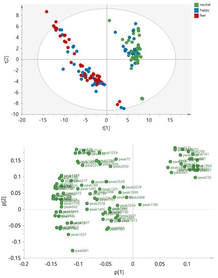 Partial least squares discriminant analysis (PLS-DA) score plots (left panels) and loading plots (right panels) based on 1655 peak areas and on two condition classes at a time: Neutral versus Fear (upper panels), Neutral versus Happy (middle panels), Fear versus Happy (lower panel). The first two principal components (PCs) t[1] and t[2] are displayed. The loading plots show weighted coefficients of the principal components. The data were not normalized and Pareto-scaled prior to analysis. Q2 values > 0.2 were statistically significant.