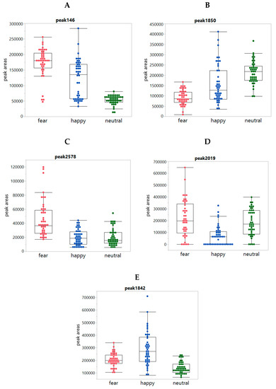 In addition, box plots comparing the emotion conditions on 94 statistically significant peaks were inspected, revealing clear differences between the conditions for 84 peaks. The remaining ten peaks showed only minor differences. From the 84 peaks, 36 peaks had increased intensities for both the Fear and Happy conditions when compared to Neutral (Figure 4A); 23 peaks had decreased intensities for both Fear and Happy conditions when compared to Neutral (Figure 4B); five peaks had increased intensities upon Fear when compared to Happy and Neutral (Figure 4C); 16 and 4 peaks were more increased (Figure 4D) and decreased (Figure 4E), respectively, in Happy when compared to Fear and Neutral. It is worth mentioning that most peak changes were not due to increased or decreased total sweat production, because there was (i) no significant difference in the total sweat production between the conditions (Figure A2, Appendix A) and (ii) no correlation between the peak intensities and the total intensities. Only for about 31 out of 94 peaks, the condition-dependent changes of the peak were related to increased total sweat production.