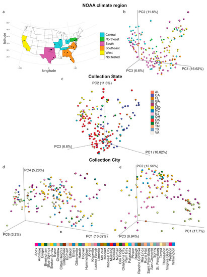 Soil samples were obtained from the University of Oklahoma Citizen Science Soil Collection Program (https://whatsinyourbackyard.org/). In total, 188 soil samples were analyzed, representing 45 cities, across 14 states in five of the USA NOAA climate regions (Figure 1a, Table 2).