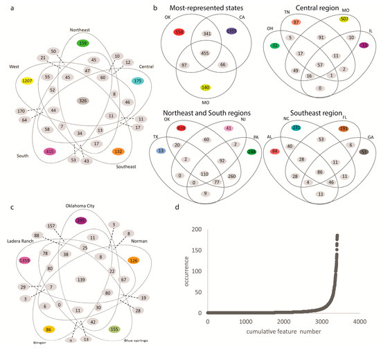 Limited between-sample overlap of detected metabolite features. (a) Venn diagram of the detected metabolite features’ distribution across the five sampled regions. (b) Venn diagrams of the metabolite features, common or unique, between states. (c) Venn diagrams of the metabolite features, common or unique, between cities with ten or more samples: Oklahoma City, Binger and Norman, OK; Ladera Ranch, CA; Blue Springs, MO. (d) Rarefaction curve showing that most detected metabolite features only occur in a single sample.