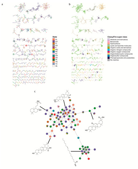 Chemical family analysis of backyard soil metabolites. (a) Feature-based molecular networking grouped metabolite features into 171 chemical families. Each node in the network represents one metabolite feature. Nodes connected to each other are structurally-related (cosine MS2 similarity score ≥0.7). Nodes are colored by the relative abundance of this metabolite feature between states. (b) Molecular network of soil samples colored by 13 selected chemical super classes as indicated in the legend. Node size based on the chemical classification scores for the ClassyFire super class. (c) Geographic heterogeneity in diterpenoid and triterpenoid family members. Nodes are colored by the relative abundance of this metabolite feature between states (colors as in panel (a)). Five structures of Global Natural Products Social Molecular Networking (GNPS) annotations for this subnetwork are displayed (level 2 annotation confidence [24]; ppm error <1; mass difference <0.001), with arrows pointing to the corresponding node.