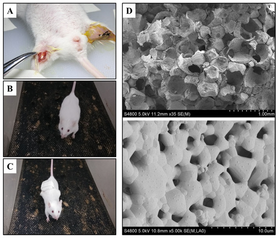 (A) The hydroxyapatite/β-tricalcium phosphate (HA/β-TCP) biomaterial transplanted site (left side) and suturing during surgery (right side). (B) Running mouse of group 2 on the treadmill. (C) Weight-bearing running mouse with rubber of group 3 on the treadmill. (D) The micropores (upper side, bar: 1 mm) and super-micropores (downside, bar: 10 μm) of HA/β-TCP biomaterials scanned by scanning electron microscopy (SEM).