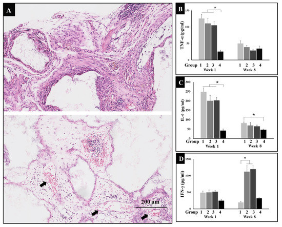 (A) Hematoxylin and eosin (HE) micrograph of group 3 (n = 6) showed inflammatory reactions and new blood vessels one week after surgery, arrow: blood vessel; bar: 200 μm. (B) The levels of tumor necrosis factor-α (TNF-α) secreted in serum of four groups (n = 5) at weeks 1 and 8; comparison among group 4 and other the three groups at week 1, * P < 0.05. (C) The levels of interleukin-6 (IL-6) secreted in serum of four groups (n = 5) at weeks 1 and 8; comparison among group 4 and other three groups at week 1, comparison between group 1 and group 4 at week 8, * P < 0.05. (D) The levels of interferon-γ (IFN-γ) secreted in serum of four groups (n = 5) at weeks 1 and 8; comparison among group 1 and groups 2, 3 at week 8, * P < 0.05. Group 1 = negative control group; Group 2 = running group; Group 3 = weight-bearing group; Group 4 = positive control group.
