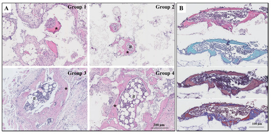 (A) HE micrograph showed bone and bone marrow formation induced by HA/β-TCP biomaterials in four groups (n = 10) in mice at week 8, *: new bone; #: new bone marrow; Group 1: negative control group; Group 2: running group; Group 3: weight-bearing group; Group 4: positive control group; bar: 200 μm. (B) The special staining of serial sections of group 3 (n = 3), HE, safranin-fast green (SFG), methylene blue-basic fuchsin solution (MBFS), and Masson-trichrome (MT) staining (from top to bottom), were conducted to identify the bone tissues, bar: 100 μm.