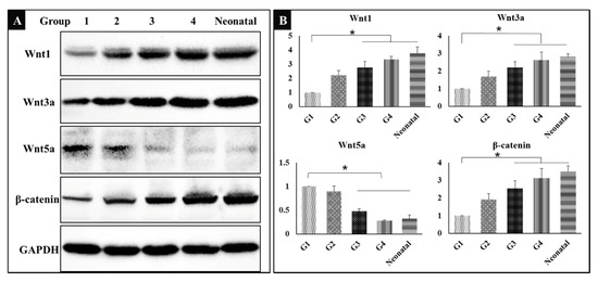 (A) Western blot showing the expression of wingless/integrated 1 (Wnt1), Wnt3a, Wnt5a, β-catenin, and glyceraldehyde-3-phosphate dehydrogenase (GAPDH) in five groups (n = 3). G1: negative control group; G2: running group; G3: weight-bearing group; G4: positive control group; Neonatal: the neonatal bone, control. (B) The corresponding gray-scale value of Wnt1, Wnt3a, Wnt5a and β-catenin in the five groups (n = 3); comparison among G1 and other three groups (G3, G4, and Neonatal), * P < 0.05.