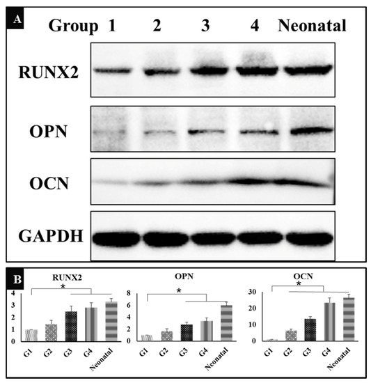 (A) Western Blot showing the expression of runt-related transcription factor-2 (RUNX2), osteopontin (OPN), osteocalcin (OCN), and GAPDH in five groups (n = 3). G1: negative control group; G2: running group; G3: weight-bearing group; G4: positive control group; Neonatal: neonatal bone, control. (B) The corresponding gray-scale value of RUNX2, OPN, and OCN in the five groups (n = 3); comparison of RUNX2 and OPN among G1 and other three groups (G3, G4, and Neonatal), comparison of OCN among G1 and other four groups (G2, G3, G4, and Neonatal), * P < 0.05.