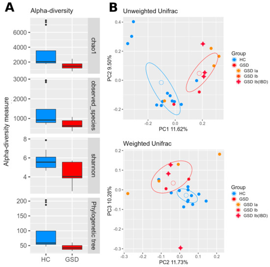 A clear difference among HC and GSD subjects was highlighted in beta-diversity as well (Figure 1B). Both unweighted and weighted Unifrac distances revealed a significant separation between groups (respectively, p = 0.004 and p = 0.01).