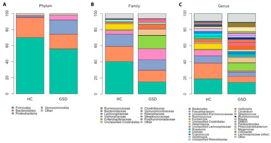 Taxonomic characterization. Stacked bar charts of taxonomy relative abundances at (A) phylum, (B) family and (C) genus levels for healthy controls (HC) and GSD patients. Only phyla, families and genera present at relative abundances >1% in at least 20% subjects (i.e.,: ≥ 4 samples) are reported. Remaining taxa are grouped in the “Other” category for each level.