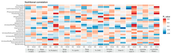 Correlations between nutritional and taxonomic values. Bacterial genera are reported in the same order of relative abundance as in Table 2, in correlation with the nutritional values shown in Table 1 according to Spearman’s correlation. Red tiles indicate a positive correlation, blue tiles a negative one for both HC and GSD groups.