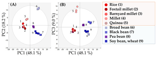 Principal component analysis (PCA) score plot of hydrophilic, low-molecular-weight compounds based on gas chromatography–mass spectrometry (GC/MS). (A) PCA score plot (PC1 and PC2). Points and labels indicate samples and sample number, respectively. Circles indicate grain-based samples, and hexagons indicate bean-based samples. (B) PCA score plot (PC1 and PC3).