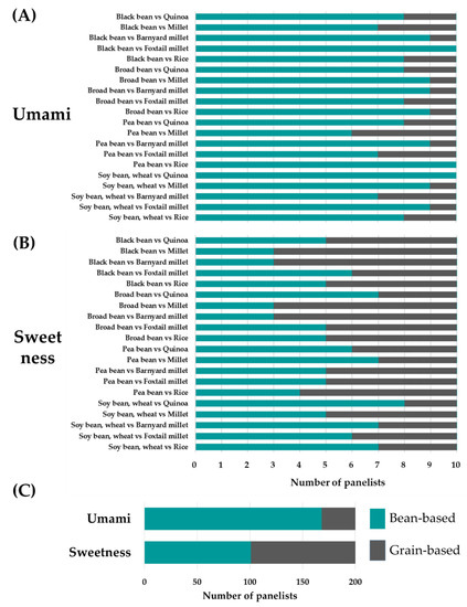 Paired comparisons of the intensities of umami and sweetness between grain-based and bean-based samples. (A), (B) Number of panelists that selected each sample in pairwise comparisons of soy-sauce-like seasonings made from grain and beans. (C) Number of panelists that selected soy-sauce-like seasonings made from grain and beans based on umami and sweetness.