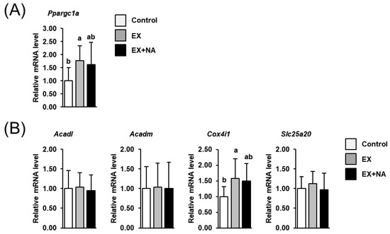 Relative mRNA levels of genes involved in mitochondrial biogenesis- (A), peroxisome proliferator-activated receptor gamma coactivator 1 alpha (Ppargc1a)) and genes encoding mitochondrial enzymes (B), acyl-CoA dehydrogenase long chain (Acadl); acyl-CoA dehydrogenase medium chain (Acadm); cytochrome c oxidase subunit 4I1 (Cox4i1); solute carrier family 25 member 20 (Slc25a20)) in gastrocnemius muscle of sedentary mice fed an NA adequate diet (Control) and mice subjected to regular endurance exercise fed either an NA adequate diet (EX) or a high NA diet (EX + NA) for 6 weeks. Bars represent means ± SD for n = 10 animals per group. Relative mRNA levels are expressed as fold of Control (= 1.0). Bars without a common lowercase letter (a, b) differ, p < 0.05.
