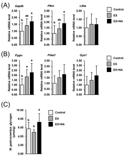 Relative mRNA levels of glycolytic genes (A), glyceraldehyde-3-phosphate dehydrogenase (Gapdh); phosphofructokinase, muscle (Pfkm); lactate dehydrogenase A (Ldha)) and genes involved in glycogenolysis and glycogen synthesis (B), glycogen phosphorylase, muscle associated (Pygm); phosphorylase kinase regulatory subunit alpha 1 (Phka1); glycogen synthase 1 (Gys1)) and glycogen concentration (C) in gastrocnemius muscle of sedentary mice fed a nicotinic acid (NA) adequate diet (Control) and mice subjected to regular endurance exercise fed either an NA adequate diet (EX) or a high NA diet (EX + NA) for 6 weeks. Bars represent means ± SD for n = 10 animals per group. Relative mRNA levels are expressed as fold of Control (= 1.0). Bars without a common lowercase letter (a, b) differ, p < 0.05.