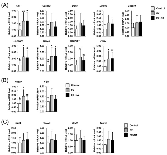 Relative mRNA levels of UPRER target genes (A), activating transcription factor 4 (Atf4); caspase 12 (Casp12); DNA damage inducible transcript 3 (Ddit3); DnaJ heat shock protein family (Hsp40) member C3 (Dnajc3); growth arrest and DNA-damage-inducible 34 (Gadd34); homocysteine inducible ER protein with ubiquitin like domain 1 (Herpud1); heat shock protein family A (Hsp70) member 5 (Hspa5); heat shock protein 90 beta family member 1 (Hsp90b1); protein disulfide isomerase family A member 4 (Pdia4)), UPRMT target genes (B), heat shock protein family E (Hsp10) member 1 (Hsp10); caseinolytic mitochondrial matrix peptidase proteolytic subunit (Clpp)) and cytoprotective genes involved in the antioxidant response (C), glutathione peroxidase 1 (Gpx1); heme oxygenase 1 (Hmox1); superoxide dismutase 1 (Sod1); thioredoxin reductase 1 (Txnrd1)) in gastrocnemius muscle of sedentary mice fed an NA adequate diet (Control) and mice subjected to regular endurance exercise fed either an NA adequate diet (EX) or a high NA diet (EX + NA) for 6 weeks. Bars represent means ± SD for n = 10 animals per group. Relative mRNA levels are expressed as fold of Control (=1.0). Bars without a common lowercase letter (a, b) differ, p < 0.05.