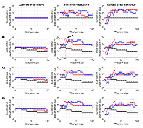 Effect of Savitzky–Golay (SG) and Loopy Multiplicative Scatter Correction (LMSC) parameters on the performance of Partial Least Squares Discriminant Analysis (PLS-DA) predictive models. For SG filtering, each derivative order (columns) was queried across a constant (black triangle), quadratic (red square), and quartic (blue circle) order polynomial, and each of these was then followed by zero, one, two, and three iterations of LMSC (rows A–D, respectively). The highest successful classification (%) of all combinations of SG and LMSC parameters was highlighted (arrow).