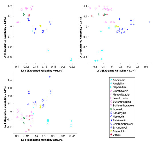 Representation of the metabolic fingerprints induced by antibiotics acting on the major biosynthetic pathways after Partial Least Squares Discriminant Analysis (PLS-DA), preceded by an optimized combination of preprocessing algorithms. The variability explained by each Latent Variable (LV) is reported for each corresponding axis. Antibiotics acting on the same major biosynthesis pathway are represented using the same color, and individual antibiotics are represented with a unique symbol.
