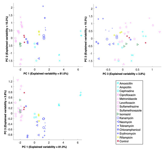Pinpointing the MOA of a candidate molecule requires identifying its molecular target; however, this is a dauting task that must often be decomposed into smaller elements, the first of which is predicting the major biosynthetic pathway targeted. For that, a PLS-DA model was built with the optimized preprocessing parameters (Figure 3). Note that, with these parameters, a successful classification of 87.5% was obtained after LOO-CV (Figure 1). Importantly, the control samples, i.e., those exposed to the solvent but not the antibiotic, were predicted as different from all the other samples. This is particularly important as it allows one to differentiate the cases where no biosynthetic pathway was affected; therefore, the lack of drug effect can be predicted for candidate molecules that have no metabolic effect. Additionally, the metabolic fingerprints induced by antibiotics targeting each of the major biosynthetic pathways were separated with as little as two latent variables, as a very simple model was sufficient to explain over 99% of the spectral variability. To ensure that the observed clusters are indeed intrinsic to the spectra, since PLS-DA score plots can often be misleading and misinterpreted [41], a PCA was conducted on the same dataset, preceded by the exact same optimal preprocessing (Figure 4). The objective of this analysis was to reinforce the PLS-DA conclusions, rather than derive new ones. Unlike the predictive model built with PLS-DA, PCA is an unsupervised technique that directly reflects the inherent structure of the data. As such, a slightly higher intra-replica variability is observed, i.e., biological replicas are slightly more disperse. Ultimately, the similarity between the PLS-DA and PCA is a good indicator that the observed results are not the results of a fortunate combination of preprocessing and PLS-DA or an artifact of using the PLS algorithm for classification instead of calibration, for which it was originally implemented. As such, these results suggest that the observed results are a direct consequence of the capability of the proposed high-throughput FTIR spectroscopy screening assay in detecting metabolic fingerprints, particularly those induced by the exposure to different antibiotics acting on the major biosynthetic pathways.
