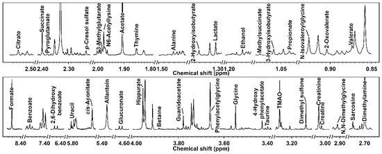 A representative spectrum of the metabolites identified in the giraffe’s urine is reported in Figure 1. In this study, we identified 39 molecules (Table S1). These molecules mainly pertain to the classes of amino acids and derivatives and organic acids and derivatives. Hippurate (30.63%), creatinine (25.17%), and phenylacetylglycine (12.64%) were the most represented metabolites.