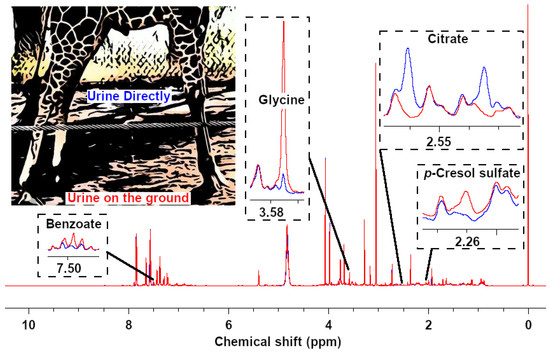 Among the completely unexplored characteristics of giraffe urine is its metabolome, the ensemble of low weight molecules produced by the cellular metabolism. Studies carried out by liquid chromatography–mass spectrometry (LC/MS) or by proton nuclear magnetic resonance spectroscopy (1H-NMR) on humans and other animals suggest that the giraffe’s urinary metabolome may be particularly informative about the general health of the animal. In horse urine, molecules revealing the action of the intestinal microbiota were found in micromolar concentrations [11,12]. Molecular patterns of the urinary metabolome linked to inflammatory processes have been identified in humans [13]. Urinary profile responses to the calorie content of the diet were identified in rat [14]. The effects of heat stress were studied in cattle by metabolomic profiling of urine [15]. Indeed, the use of urine as a source of biological data in giraffes could be a suitable alternative, due to its non-invasive approach that could avoid the immobilization of animals.