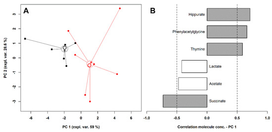 Three principal components (PCs) were accepted by the algorithm to depict the overall data features. PC 1, accounting for 59% of the variance thus represented, indeed significantly summarized the peculiarities connected to sex (p < 0.05), with female and male individuals appearing respectively at low and high PC scores. Among these molecules, hippurate, phenylacetylglycine, and thymine were more abundant in the urine of male individuals, while lactate, acetate, and succinate were more concentrated in the females’ urine.